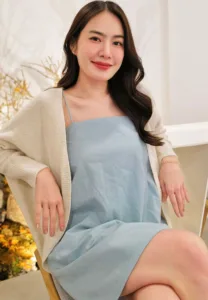 • รูปเดรสสั้นสีฟ้า สวมเสื้อคลุมแขนยาว หันหน้ามายิ้มให้เราแบบเบา ๆ ทำเอาใจเต้นแรงแบบหาสาเหตุไม่ได้ ให้ฟีลเหมือนกำลังจูงมือแฟนและหันมายิ้มให้ด้วยความรักกันเลยทีเดียว